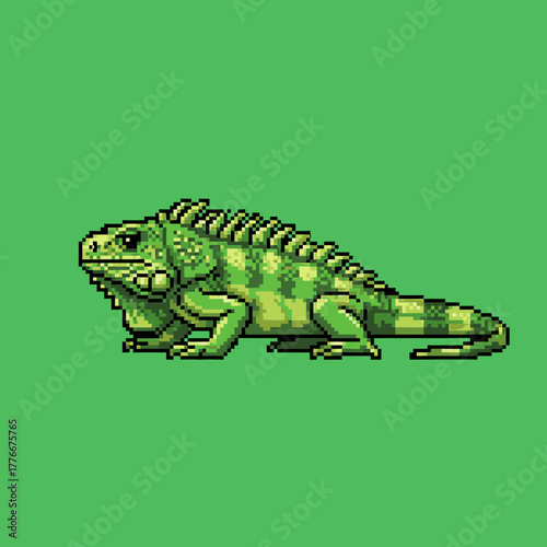 © Rosyad, Fototapeta premium Pixel art illustration of a green iguana with detailed scales and spikes on a solid green background.