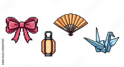 Obraz premium Pixel art japanese culture icons: bow, fan, lantern, origami crane