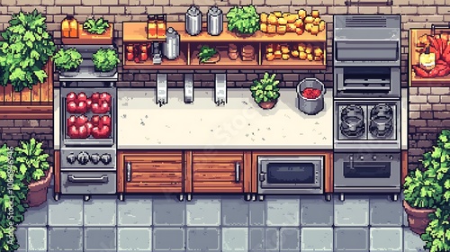 © Woranuch, Obraz premium Pixel Art Kitchen Countertop Overhead View of a Modern, Well-Equipped Kitchen Space.