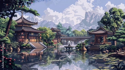 © Siasart Studio, Fototapeta premium pixel art landscape featuring a serene lake surrounded by lush green trees, a small brown building, and a vibrant red flower