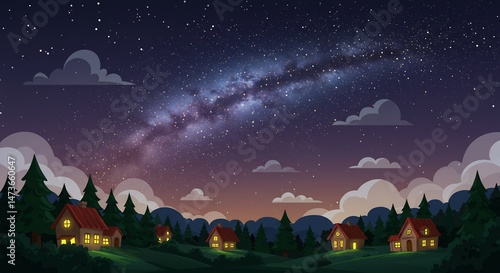 © タンロック, Naklejka premium Pixel Art Night Village Under Milky Way Galaxy