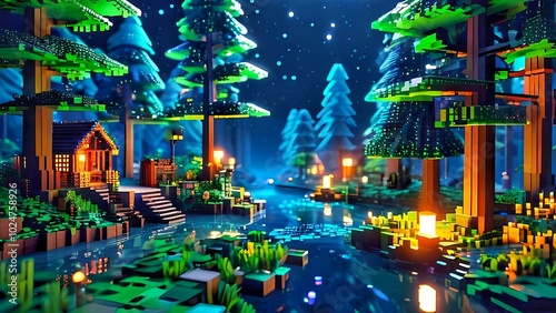 © F2Art Gallery, Naklejka premium Pixel Art Nighttime Forest with River and Cabins Illustration