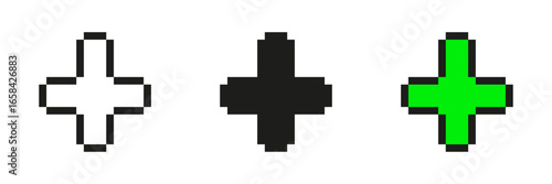 Obraz premium Pixel Art Plus Icon Set. Addition And Positive Symbols In Pixelated Style. Includes White, Black, And Green Variations. Isolated Vector Illustration