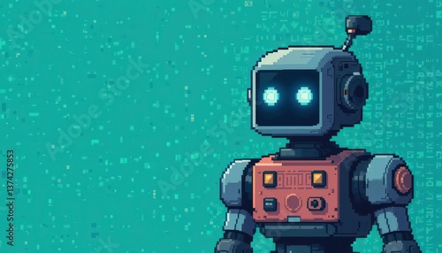 Fototapeta premium Pixel art robot displayed on a teal 8 bit background. Evoking retro gaming nostalgia with a modern color palette.
