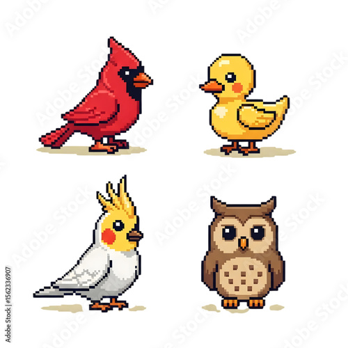 Fototapeta premium Pixel Art Set of Four Colorful Cartoon Birds and Owl in Retro Style