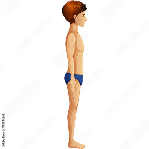 © zakiahsolehnozz, Fototapeta premium Pixel Art Side Profile Full Body of a Young Man Wearing Blue Swim Trunks Against a Transparent White Background with Brown Hair and Fair Skin