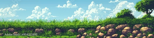 Fototapeta premium Pixel Art Spring Summer Nature Landscape, Video Game Outdoor Platformer Asset...