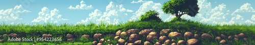 Fototapeta premium Pixel Art Spring Summer Nature Landscape, Video Game Outdoor Platformer Asset...