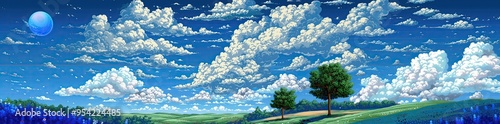 © The Art Company, Fototapeta premium Pixel Art Spring Summer Nature Landscape, Video Game Outdoor Platformer Asset Background, 8bit Retro Trees Grass Meadow Blue Sky Backdrop, Side-scroller Side View Pixelated Valley