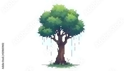 © farikhin, Obraz premium Pixel art style illustration of a tree with rain on white background illustration