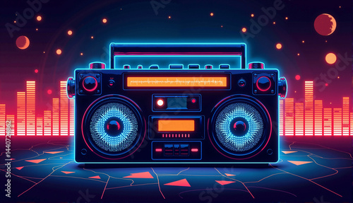 Obraz premium Pixel art style retro boombox with equalizer graphics, glowing elements