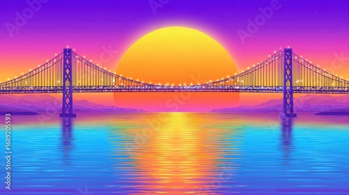 Fototapeta premium Pixel Art Sunset Cityscape with Suspension Bridge