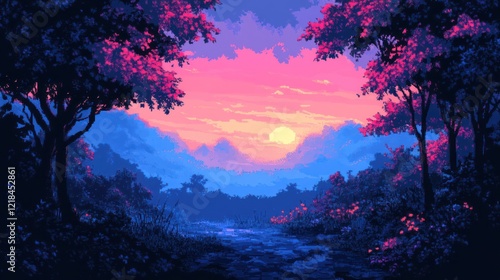 © fatih, Naklejka premium Pixel art sunset in a mystical forest.