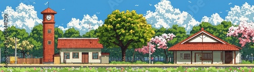 © Focusshop, Naklejka premium Pixel art town scene with clock tower, houses, trees, and cherry blossoms. Use Background, wallpaper, social media post