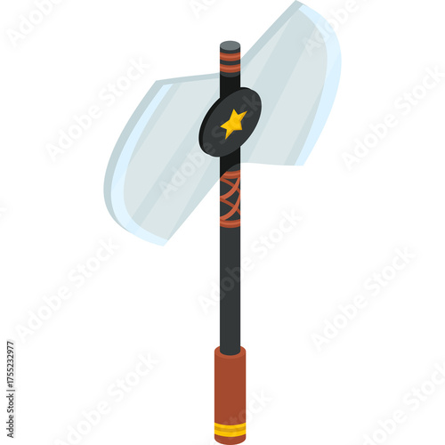 © mirawatitristiantoro, Naklejka premium Pixel Art Two Sided Axe With A Star Emblem And Orange Grip On A Transparent Background