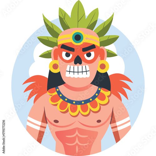 © alyastutisaraswatieu, Fototapeta premium Pixel Art Warrior With Fierce Expression Wearing Feathered Headdress and Tribal Necklace Against Sky and Clouds