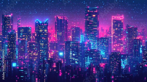 © Thanthara, Fototapeta premium Pixel Cyberpunk neon city night. Futuristic city scene in a style of pixel art. 80's wallpaper. Retro future backdrop. Urban scene.