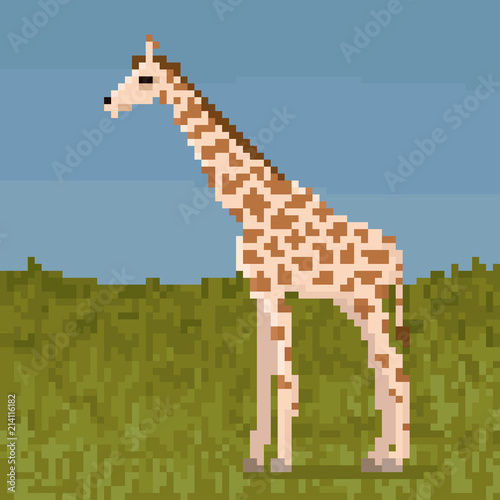 © dzha, Obraz premium Pixel giraffe on a grass. 8 bit vector illustration