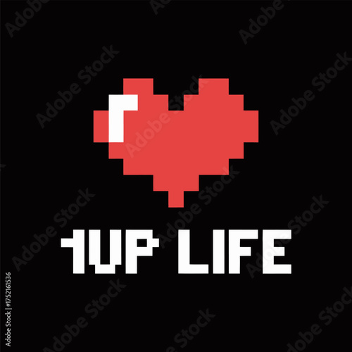 Fototapeta premium Pixel heart life icon, retro 1UP gaming message, arcade style graphic, nostalgic gamer poster, vector illustration