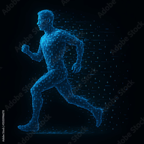 Fototapeta premium Pixel Runner in a Stream of Digital Light. A futuristic illustration of a runner made of digital blue pixels, dissolving into binary code. Represents speed, data, and transformation.