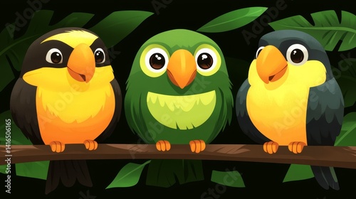 © Artajar, Fototapeta premium Pixelated aviary harmony three playful tropical birds perched branch vibrant feather patterns detailed plumage enchanting pixel art illustration