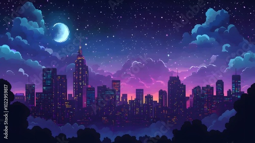 Fototapeta premium Pixelated Cityscape at Night with Crescent Moon and Stars