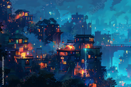© Ami, Fototapeta premium Pixelated Cityscape at Night with Illuminated Buildings in Digital Art Style