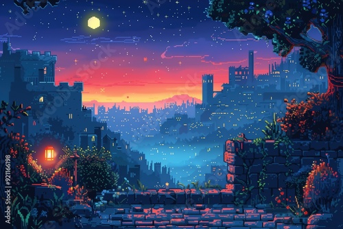 © cochisevisuals, Fototapeta premium Pixelated cityscape at twilight with a full moon and stars.