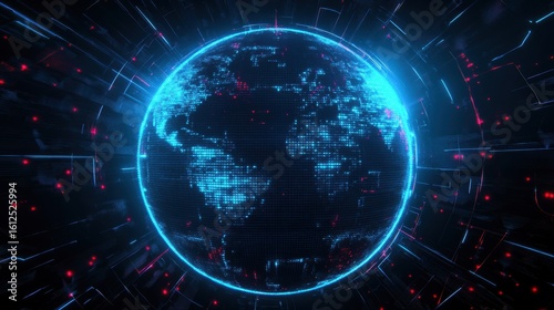 © Gradual Growth, Obraz premium Pixelated Cyber World Globe with Glowing Tech Grid and Data Nodes.