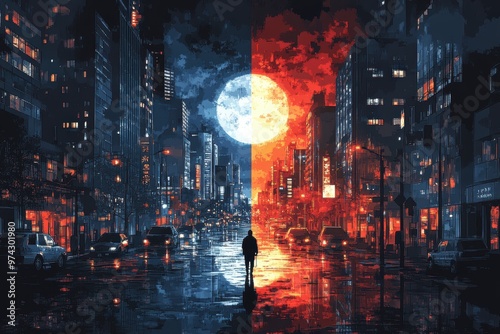 © ST22Studio, Obraz premium Pixelated Day-Night Split in Retro Video Game Scene with Copy Space | Illustration in Dynamic Silhouette Style