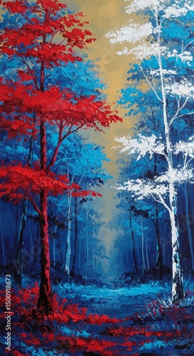 © Judy, Naklejka premium Pixelated Forest Illustration with Red White and Blue Trees on Abstract Background