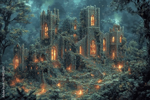 Fototapeta premium Pixelated Medieval Fortress with Flickering Torches and Overgrown Ivy -...