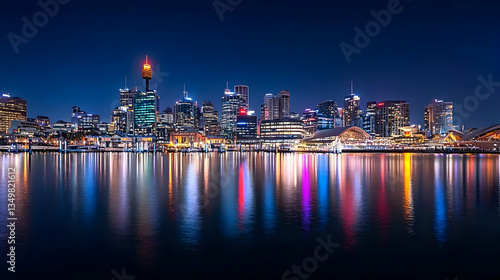 © julio, Fototapeta premium Pixelated Night City Skyline Reflection