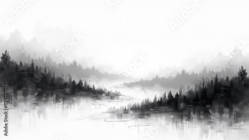 © Nima, Fototapeta premium Pixelated noise overlays.Abstract glitch art landscape with smooth gradients, featuring a pixelated halftone texture. Seamlessly blended white and black, evoking a sense of retro tech.