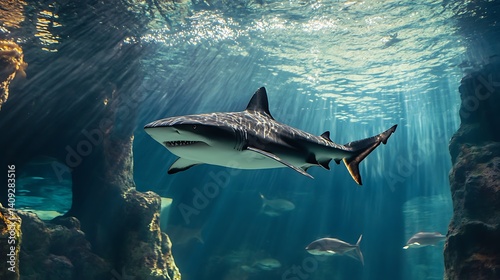 © atar, Fototapeta premium Pixelated Shark Swimming Underwater with Light Rays and Corals in Ocean Habitat