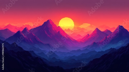 © novian, Fototapeta premium Pixelated Sunset Over a Mountain Range