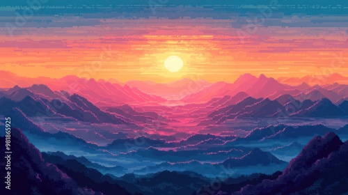 © novian, Fototapeta premium Pixelated Sunset Over a Mountain Range