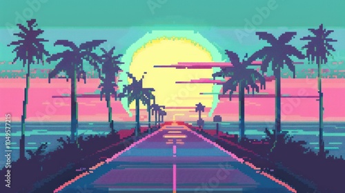 Naklejka premium Pixelated Sunset Road with Palm Trees