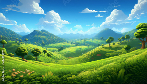 Fototapeta premium pixelated terrain with bright green hills a sunny sky and game like aesthetics reminiscent of classic platformer games