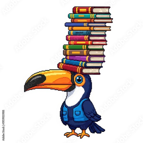 Fototapeta premium Pixelated tropical bird balances tall stack of colorful literature atop its head