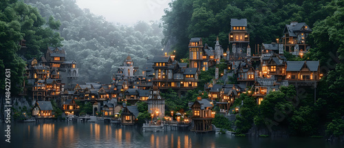 © Parsudi, Obraz premium Pixelized Illuminated Asian Village Landscape