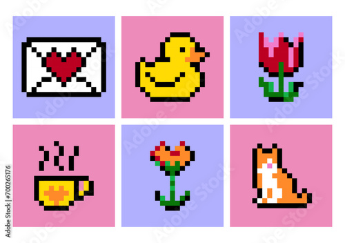 Obraz premium Pixels Y2k trendy stickers, cute abstract elements, Minimal graphic design, 8 bit, gamification, Pixel art, flower, cat, duck.