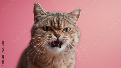 © wasan, Obraz premium Pixie-bob, angry cat baring its teeth, studio lighting pastel background