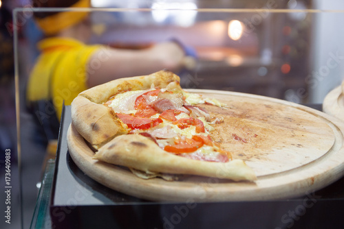 © DmyTo, Obraz premium Pizza in the pizzeria window and cook near the oven in the background