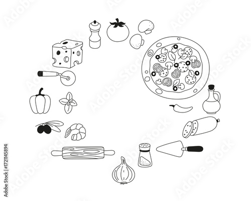 Obraz premium Pizza set. Frame. Black and white image.