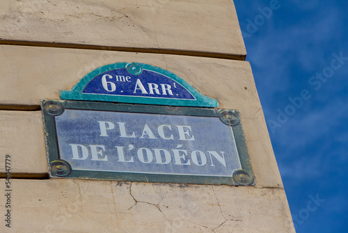 Obraz premium Place de l'Odeon street sign, one of the most famous squares in Paris, France.