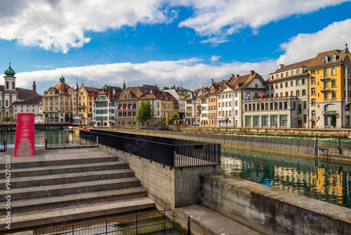 Fototapeta premium Places at Lucerne, Reuss river with some typical house at the background