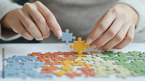 Fototapeta premium Placing final puzzle piece in colorful jigsaw puzzle brings joy