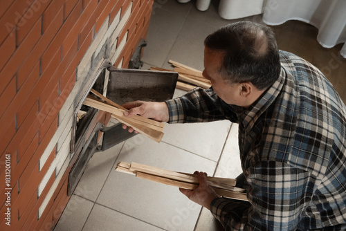 © svetlana_cherruty, Naklejka premium Placing thin kindling into brick stove by caucasian adult man in checkered shirt while preparing fire inside warm indoor room. Winter Firewood Routine Preparing and Lighting Wood Stove