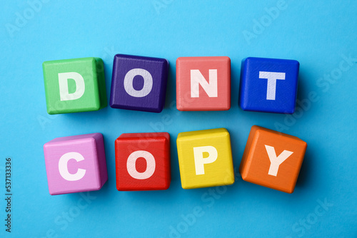 Obraz premium Plagiarism concept. Phrase Don't Copy made of color cubes with letters on...